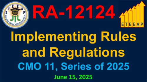 RA-12124 Implementing Rules and Regulations (ETEEAP-IRR)CHED Memorandum Order 11, Series of 2025 (cmo11s2025) On March 3, 2025, President Ferdinand Marcos, Jr. signed the RA-12124 known as the ETEEAP Bill. This is to establish the May 10, 1996 Executive Order 330 (EO330) of … Continue reading RA12124 IRR (cmo29s2025)
